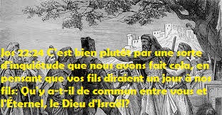 Josué 22:24 C’est bien plutôt par une sorte d’inquiétude que nous avons fait cela, en pensant que vos fils diraient un jour à nos fils: Qu’y a-t-il de commun entre vous et l’Éternel, le Dieu d’Israël? (LSV)
