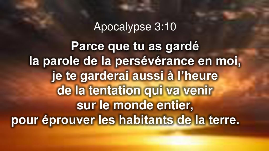 Je te garderai aussi à l’heure de la tentation qui va venir sur le monde entier pour éprouver les habitants de la terre